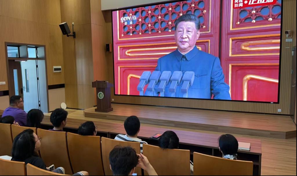“中华民族伟大复兴势不可挡!人类和平与发展的崇高事业必将胜利!”铿锵声音响彻云霄,历史回响激荡人心。9月3日上午,纪念中国人民抗日战争暨世界反法年大会在北京天安门广场隆重举行。我院组织师生通过线上分散观看、线下318报告厅集中观看等多种方式观礼九三阅兵盛况,并畅谈和分享观看九三阅兵的感受和体会。